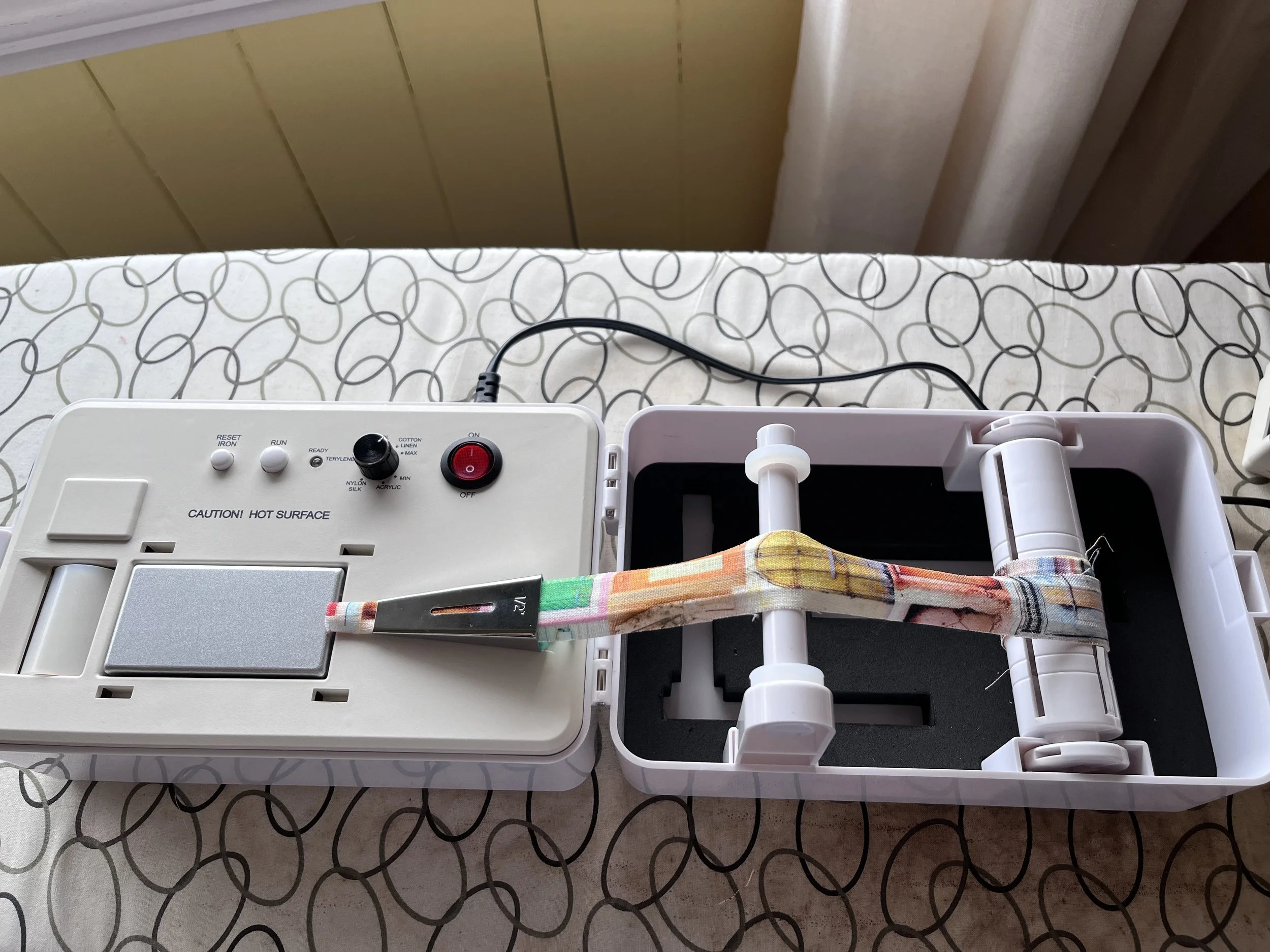 For this robe I used the Simplicity bias tape maker to make the belt loops and hanging hook. For really narrow pieces like these I absolutely loathe sewing them right sides together and turning them out. Instead, I made them like bias tape and topstitched. Who cares if you can see the stitches? The less time I have to spend turning loops the better. The bias tape maker is a cool gadget.